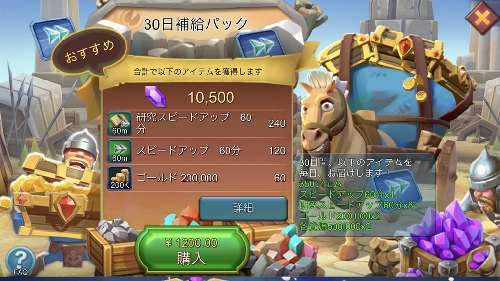 30日補給パックでは、本来入手が難しい研究関連のアイテムを獲得できるので、どちらかと言えば、研究に特化したパックであると言えます。(研究と建築両方含まれていますが)