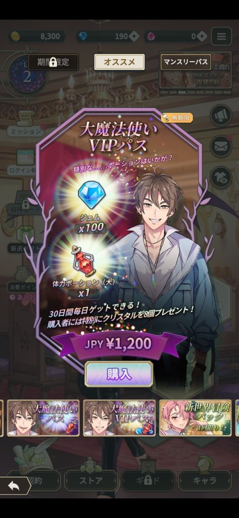 ガチャを回すために、ジェムやクリスタルが必要となりますが、大魔法使いVIPパスを購入すると30日間ジェムを獲得できるので、最大3000個のジェムを獲得できます。