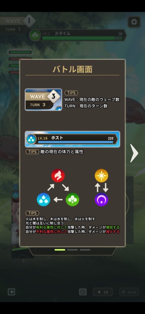戦闘ではキャラクターに属性があり、有利な属性で敵を攻撃すると通常よりも大きなダメージになるので属性にあったらキャラ編成をすることが大事です。