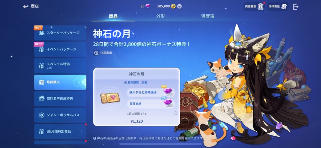 毎日プレイするのであれば、毎日ログインで神石がゲットできる神石の月がおすすめです。