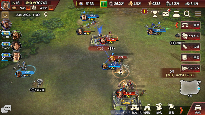やはり武将が不足していると戦いに挑めなかったり、君主レベルが低いままだと機能が十分に開放されないといったことがあるため、毎日の積み重ねが重要です。
