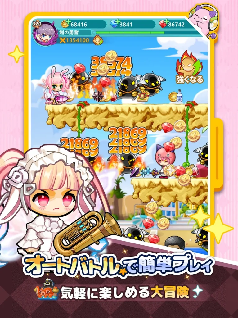 本作の最大の特徴は、簡単な操作で遊べる放置系RPGであることです。戦闘はオートで進行し、オフラインの間もキャラクターが自動で経験値やアイテムを獲得できるため、忙しいプレイヤーでもスムーズに成長させることが可能です。