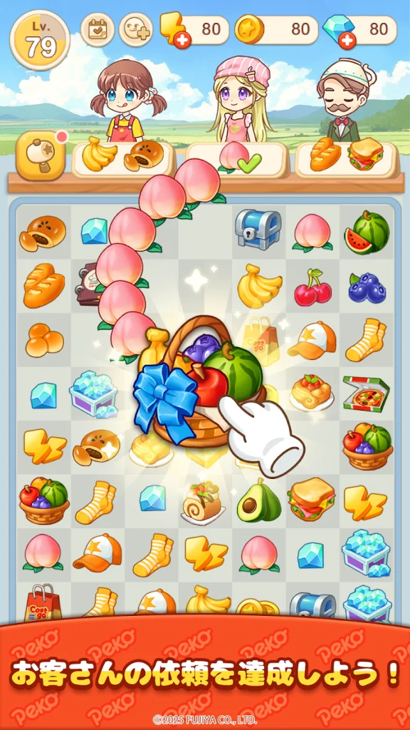 プレイヤーの目的は、ボード上にあるアイテム同士を合体(マージ)させて新しいアイテムを作り出し、様々な「オーダー(注文)」に応えていくこと。 オーダーをクリアすると手に入る「ペコキャンディ」を使って、ペコちゃんの衣装を集めたり、可愛いお部屋を作り上げていきます。